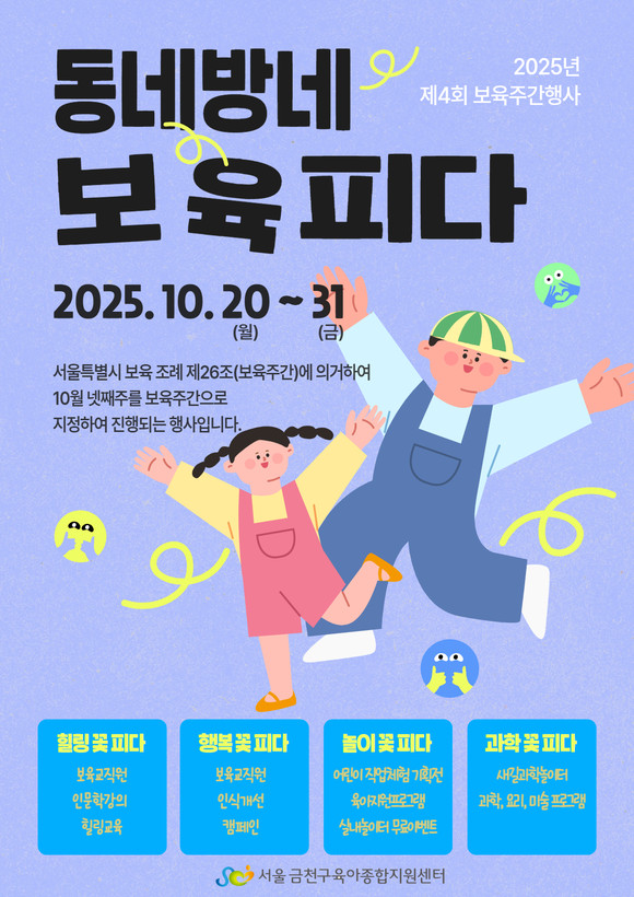 이번 행사는 ‘함께 키우는 따뜻한 금천, 행복한 보육공동체’를 주제로, 금천구육아종합지원센터 주관으로 추진한다. 지역사회가 함께 아동의 성장을 지원하고 보육의 사회적 가치를 확산하기 위한 자리다.