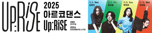 서울 대학로 아르코예술극장 소극장에서 11월 5일부터 11월 12일까지 열리는 <아르코 댄스 UP:RISE>는 예술극장이 무용 창작자들의 예술적 성장과 터닝포인트를 지원하기 위해 마련한 프로그램이다. 2024년 <아르코 댄스&커넥션>에서 출발해, 올해 그 취지를 더욱 분명히 하고자 <아르코 댄스 UP:RISE>라는 이름으로 새롭게 단장했다.