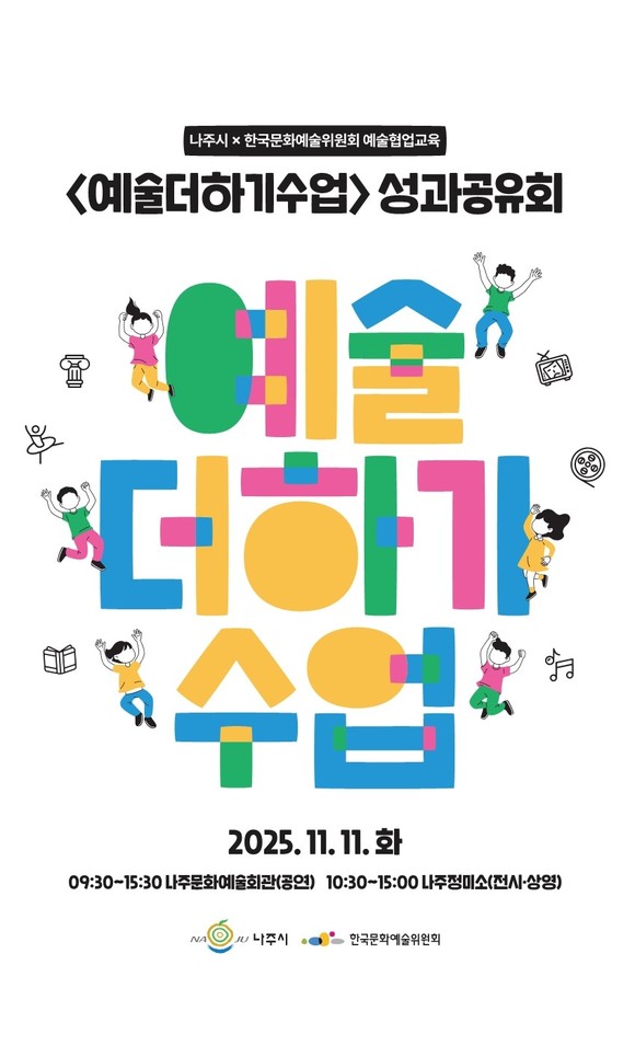한국문화예술위원회(위원장 정병국, 이하 '아르코(ARKO)')는 오는 11월 11일(화)에 나주시와 협업하여 추진한 예술교육 <예술더하기수업>의 성과공유회를 나주문화예술회관과 나주정미소에서 개최한다고 밝혔다.