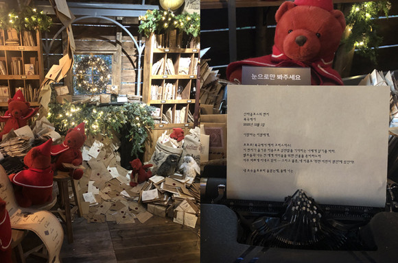 이어 오두막으로 지어진 다양한 공방들을 만난다. 나무 재질의 오두막은 공간에 포근한 느낌을 더한다. 편지공방엔 전 세계 아이들을 위한 편지들을 하나하나 직접 쓰고 있는 해리들의 모습이 눈길을 끈다. 편지들을 살펴보니 한국어를 비롯해 일본어, 영어 등 세계 각국의 언어들이 적혀 있었다. 여기엔 정지영 현대백화점 사장의 이름이 적힌 편지도 포함돼 있다.