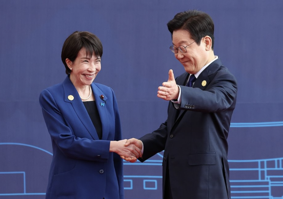 이재명 대통령이 10월 31일 경주화백컨벤션센터(HICO)에서 열린 2025 아시아태평양경제협력체(APEC) 정상회의에 참석한 다카이치 사나에 일본 총리를 맞이하고 있다. 사진=연합뉴스
