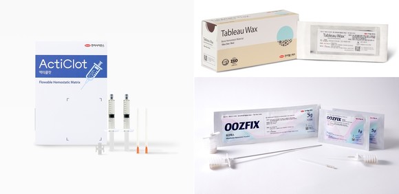 해당 제품은 ▲흡수성 분말형 보조지혈제 우즈픽스 ▲폴록사머 기반 흡수성 뼈 지혈제 타블로왁스 ▲전분 유래 고분자 매트릭스에 트롬빈을 결합한 액티브 지혈제 액티클랏으로, 한미사이언스 의료기기 분야의 핵심 제품으로 구성했다.
