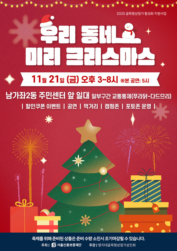 서울 서대문구 남가좌2동(동장 김윤정)은 명지대학교 앞 골목형 상점가의 활력을 더하고 학생과 상인, 주민이 함께하는 소통의 장을 마련하기 위해 이달 21일 오후 3시부터 저녁 8시까지 남가좌2동주민센터 앞 광장에서 ‘우리 동네 미리 크리스마스’ 축제가 열린다고 밝혔다.
