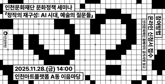 (재)인천문화재단(대표이사 직무대행 허회숙)은 오는 11월 28일(금) 오후 2시 인천아트플랫폼 A동 이음마당에서 문화정책 세미나 <창작의 재구성: AI 시대, 예술의 질문들>을 개최한다.