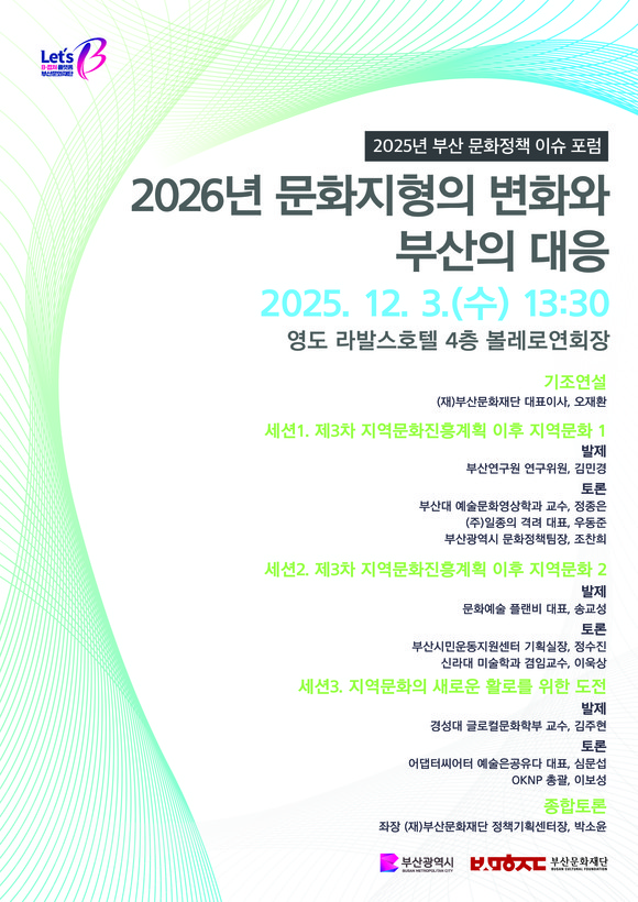 부산문화재단(BSCF, 대표이사 오재환)은 오는 12월 3일(수) 오후 1시 30분, 영도 라발스호텔 연회장에서 <2025 부산 문화정책 이슈 포럼>을 개최한다.