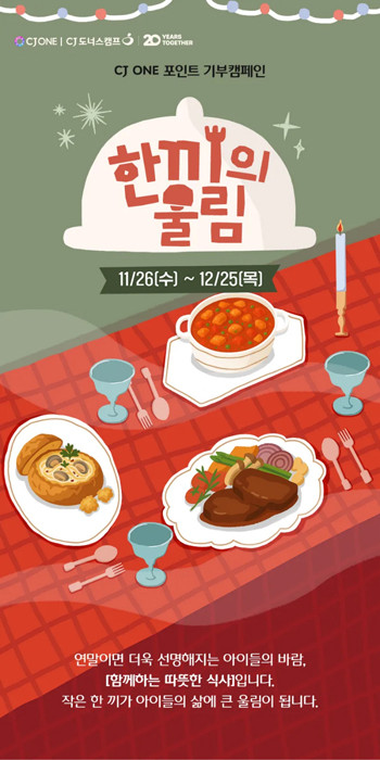 이번 캠페인은 이달 26일부터 다음달 25일까지 CJ도너스캠프 홈페이지 또는 CJ ONE 앱에서 한끼의 울림 배너를 통해 CJ ONE 포인트나 신용카드·휴대폰 결제 등으로 참여할 수 있다.