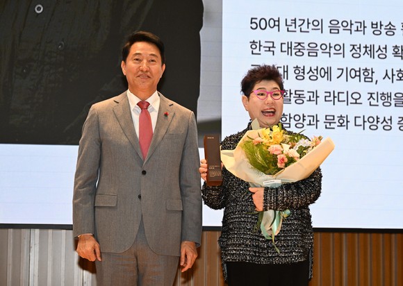 오세훈 서울시장이 1일 ‘제74회 서울특별시 문화상’ 시상식에서 수상자(문화산업 분야 양희은 씨)에게 상패 전달 후 기념 촬영하고 있다. 사진=서울시청
