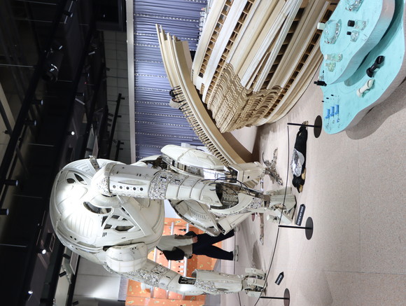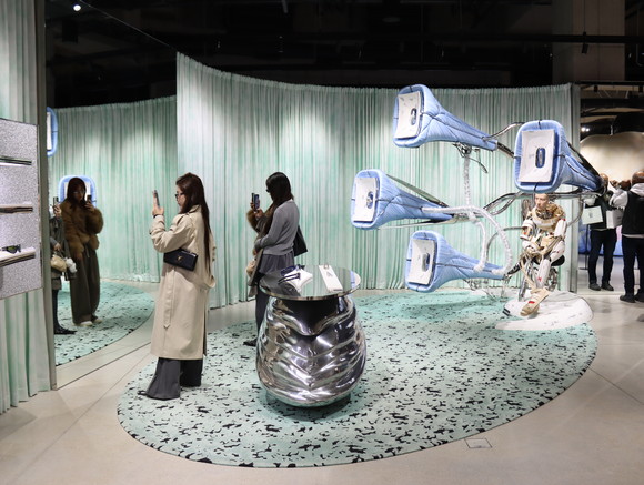 하우스노웨어 서울 매장에 전시된 로봇 전시물과 제품. 제품을 압도하는 미래지향적 로봇 전시물이 시선을 사로잡으며, 그 우측에 회사의 '탬버린즈' 브랜드 제품이 전시돼 있다. 사진=김예은 기자