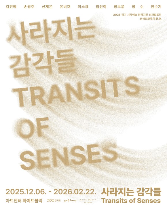 이어서 아트센터 화이트블럭 《사라지는 감각들 TRANSITS OF SENSES》 전시가 12월 6일부터 26년 2월 22일까지 개최된다. 속도와 정보가 일상을 지배하는 시대, 전시는 ‘읽기’ 중심의 세계에서 다시 ‘느끼기’로 돌아가는 감각의 전환을 주제로 삼는다. 김민혜, 손광주, 신재은, 유비호, 이소요, 임선이, 장보윤, 정수, 한수지 등 9명의 작가는 회화, 설치, 사진, 영상 등 70여 점의 작품을 통해 데이터로 환원되지 않는 몸의 감각, 기억, 자연, 언어의 층위를 탐구한다. 감각이 소멸하는 것이 아니라, 다른 형식과 매체로 이동하고 전이되는 과정에 주목하며, 관람객이 빛과 리듬, 온도, 냄새와 같은 미세한 감각 신호를 다시 의식하도록 유도한다.