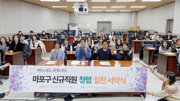 이날 신규 직원들은 청탁 근절과 직무수행의 공정성 등에 관한 「부정청탁 및 금품등 수수의 금지에 관한 법률」과 「서울특별시 마포구 공무원 행동강령」의 주요 내용을 담은 반부패 청렴서약서를 낭독했다.