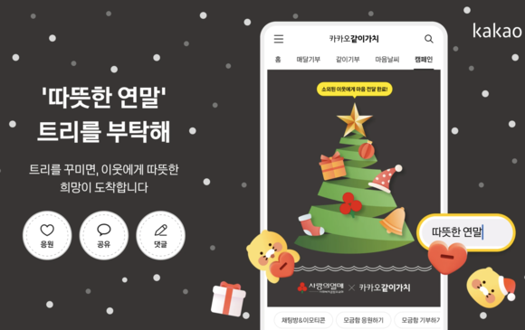 카카오의 사회공헌 플랫폼 카카오같이가치가 연말을 맞아 이용자들이 손쉽게 참여할 수 있는 기부 캠페인 ‘따뜻한 연말, 트리를 부탁해’를 오는 19일까지 운영한다고 10일 밝혔다.