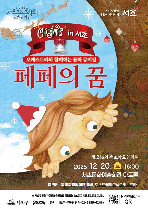 서울 서초구(구청장 전성수)는 오는 20일 오후 4시, 서초문화예술회관 아트홀에서 2025년 송년음악회 「크리스마스 in 서초-페페의 꿈」를 개최한다고 밝혔다.