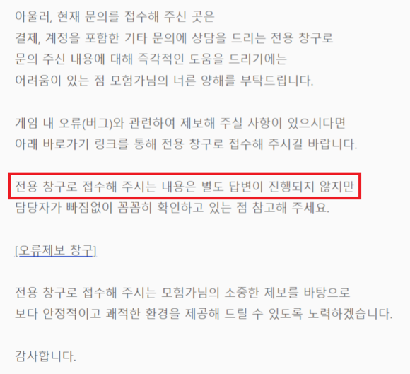◆ 유저 서별하 “인게임 문의는 막혀 있고, 공식 답변은 돌아오지 않는다”