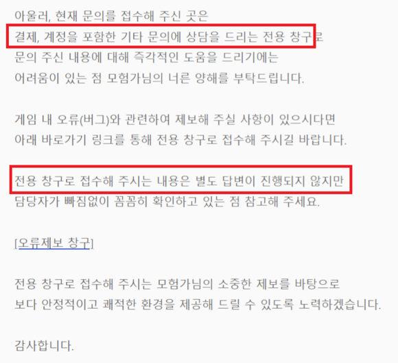 실제로 인게임 고객센터는 “전용 창구로 접수해주시는 내용은 별도 답변이 진행되지 않는다”고 안내하고 있다. 다시 말해, 일반 유저는 결제나 계정 문제를 제외하면 게임 운영사로부터 어느 경로에서도 공식적인 응답을 받을 수 없는 상태에 놓여 있다.