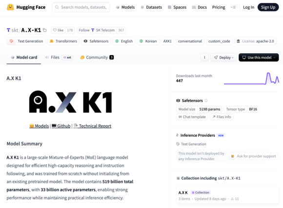 SK텔레콤 정예팀이 매개변수 5190억 개 규모의 초거대 인공지능 모델 ‘A.X K1’의 기술 보고서를 오픈소스 플랫폼 허깅페이스에 공개했다.