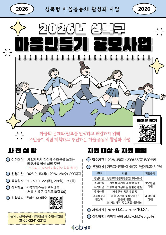 서울시 성북구(구청장 이승로)는 마을공동체 활성화를 위해 「2026년 성북구 마을만들기 공모사업」을 진행한다.