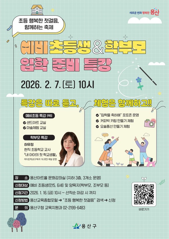 참여 대상은 예비 초등학생(만 5~6세)과 보호자 등 총 150명이며, 신청은 1월 16일부터 선착순으로 접수한다. 참여 신청은 용산구 교육종합포털을 통해 온라인으로 가능하며, 학부모 특강에 한해 행사 당일 현장 접수도 병행 운영한다.