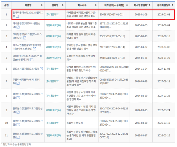 앞서 대웅제약은 2024년 11월 소아용 가래약 ‘엘도스시럽’ 일부 제품에서 항생제 성분이 검출되며 식약처로부터 2등급 위해성으로 분류돼 영업자 회수 조치에 들어간 바 있다. 같은 해 9월에는 손발톱 무좀약 ‘주플리에외용액’ 일부 제품이 불순물 기준 부적합 판정을 받아 회수됐다.
