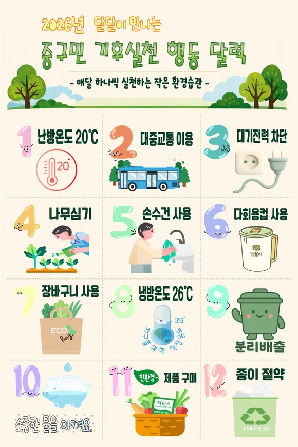 서울 중구가 올해부터 '달달이 기후실천 행동'을 운영하며 주민들의 녹색생활 실천의지를 북돋는다. 올해 첫 미션은 ‘난방온도 20℃ 유지하기’고, 다음달 미션은 '대중교통 이용하기'다.