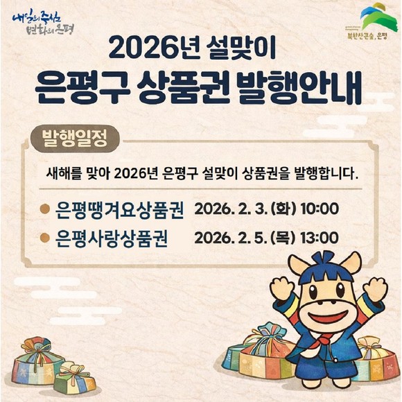 서울 은평구(구청장 김미경)는 설 명절을 맞아 오는 2월 첫째 주에 은평땡겨요상품권과 은평사랑상품권을 발행한다고 밝혔다.