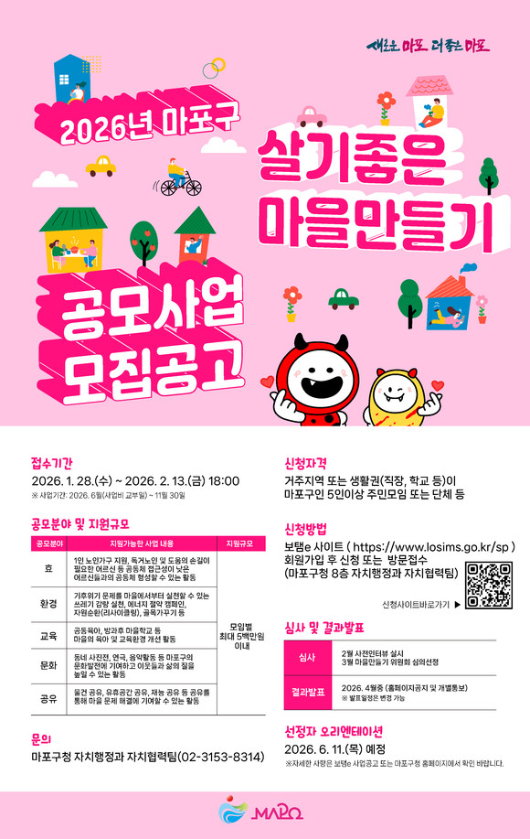 서울 마포구(구청장 박강수)는 주민이 제안한 아이디어를 지원해 마을공동체 활성화를 도모하는 ‘2026년 마포구 살기좋은 마을만들기 공모사업’ 참여 대상자를 2월 13일까지 모집한다.