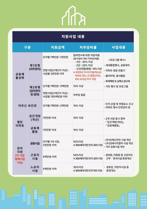▲ 공동체 활성화 분야는 주민 간 교류와 참여를 확대하기 위한 행사·프로그램을 지원하는 사업이다. 단지별 최대 1천만 원, 3개 단지 이상 연합 사업의 경우 최대 3천만 원까지 지원한다.
