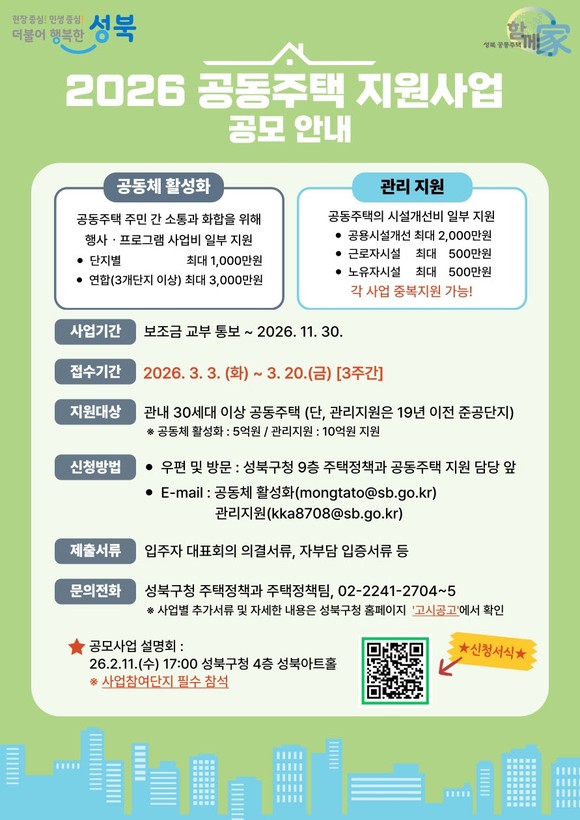 서울 성북구(구청장 이승로)가 이웃 간 소통과 화합을 증진하고 쾌적한 주거환경 조성을 지원하기 위한 ‘2026년 공동주택 지원사업’ 공모를 실시한다.