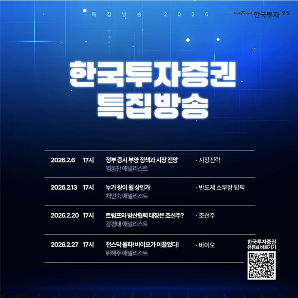 이번 특집 방송은 ‘정부의 정책 지원과 증시 전망’을 주제로 마련됐다. 퀀트 분석가 염동찬 한국투자증권 애널리스트가 출연해 올해 정부의 증시 지원 정책을 비롯해 국내증시복귀계좌(RIA) 출시로 인한 수급 여건 변화, 2026년도 기업 실적을 바탕으로 한 연간 국내 증시 전망을 투자자들에게 설명할 예정이다.