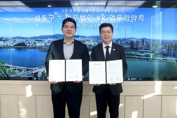 서울 성동구(구청장 정원오)는 지난 1월 29일 직원 보호 등 법률 지원 협력체계 강화를 위해 법무법인 YK와 업무협약을 체결했다고 밝혔다.