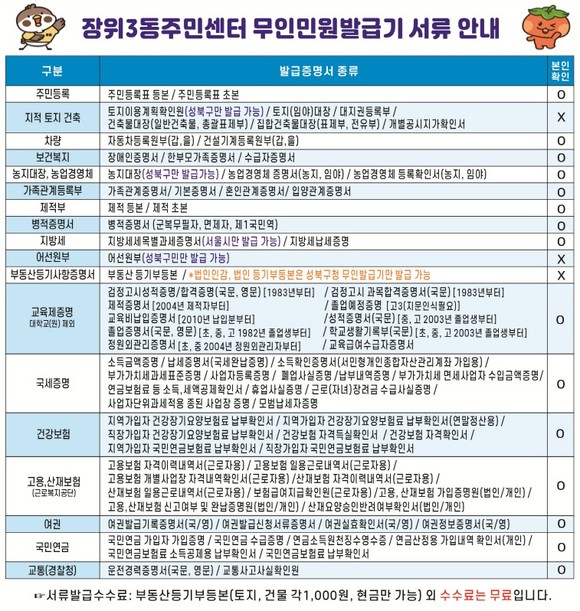 서울 성북구(구청장 이승로) 장위3동주민센터가 무인민원발급기 발급 서류 안내문을 제작·부착해 발급기 이용 활성화를 위한 홍보를 강화한다.