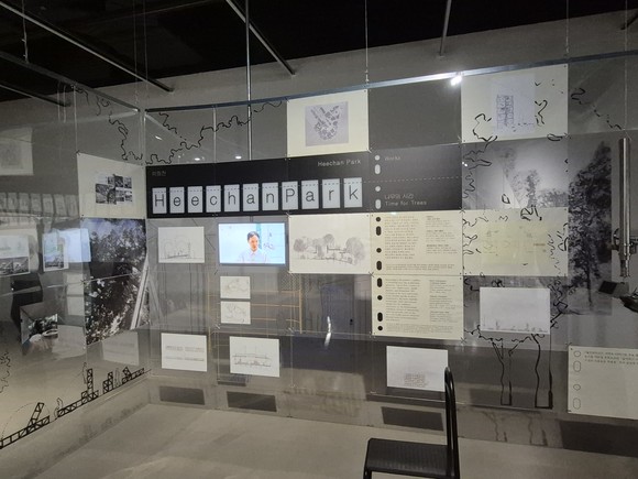 박희찬 작가의 <나무의 시간>은 <그림자 감지 장치>, <자르디니 건축 여행자>, <엘리베이티드 게이즈> 등 세 개의 유닛으로 구성된다. 나무가 만든 그림자를 캡처할 수 있는 디바이스와 팀별로 사용하도록 되어 있는 엘리베이티드 게이즈는 관람객들이 직접 높이를 맞춰가면서 옥상에 달려 있는 360도 카메라를 보고 직접 숲의 소리까지 경험할 수 있다. 또한 팀 참가자들은 한국관의 경계가 어떻게 바뀌고 있는지 관찰한다. 귀국전에서는 현지에서만 가능한 경험을 복제하기보다, 베니스에서 채집한 감각을 기록과 기억의 층위에서 다시 불러낸다. 초기 아이디어를 물리적으로 구현하는 과정에서 생산된 드로잉을 중심으로 비물질적인 요소를 물질화하는 감각을 보여준다. 더불어 베니스 현지에서 관객이 작품을 경험하는 영상을 통해 이런 작가의 의도가 전달되는 과정을 보여준다.