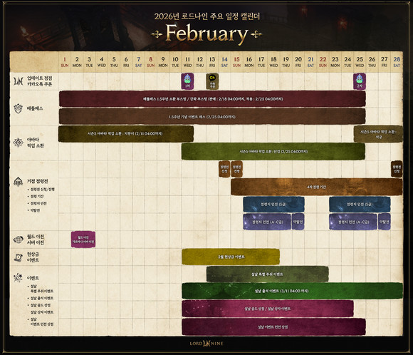 이번에 공개된 로드나인의 2월 캘린더에는 ▲1.5주년 기념 배틀패스 2종 ▲지팡이·단검 아바타 픽업 일정 ▲4차 거점 점령전 등 주요 이벤트와 콘텐츠 일정이 담겼다.