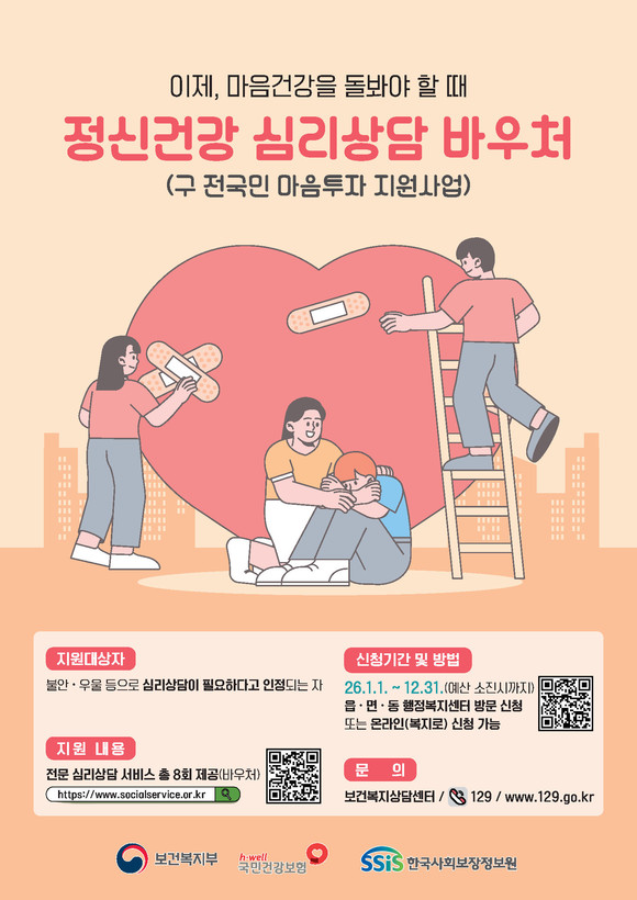 지원 대상은 ▲정신건강복지센터·정신의료기관·Wee센터·대학교 상담센터 등에서 심리상담 필요성을 인정받아 의뢰서를 발급받은 주민 ▲국가건강검진 결과 중등도 이상의 우울이 확인된 주민 ▲자립준비청년, 보호연장아동 등 정신건강 취약계층이며, 재난 피해자 및 유가족도 포함된다.