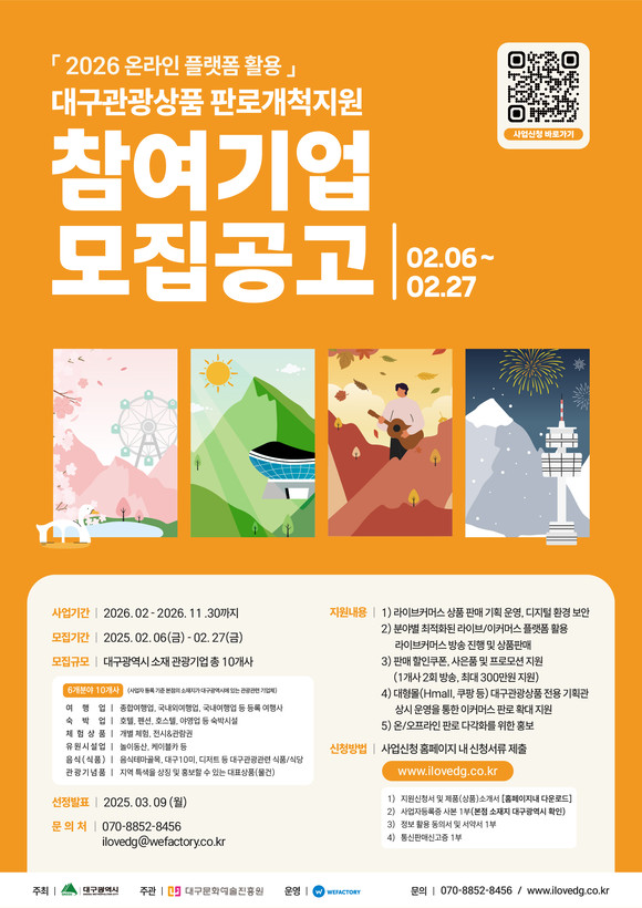 대구광역시와 대구문화예술진흥원 관광본부(이하 문예진흥원)는 지역 관광사업체의 경쟁력 강화를 위해 「2026년 온라인 플랫폼 활용 대구 관광상품 판로개척 지원사업」을 추진한다고 밝혔다.