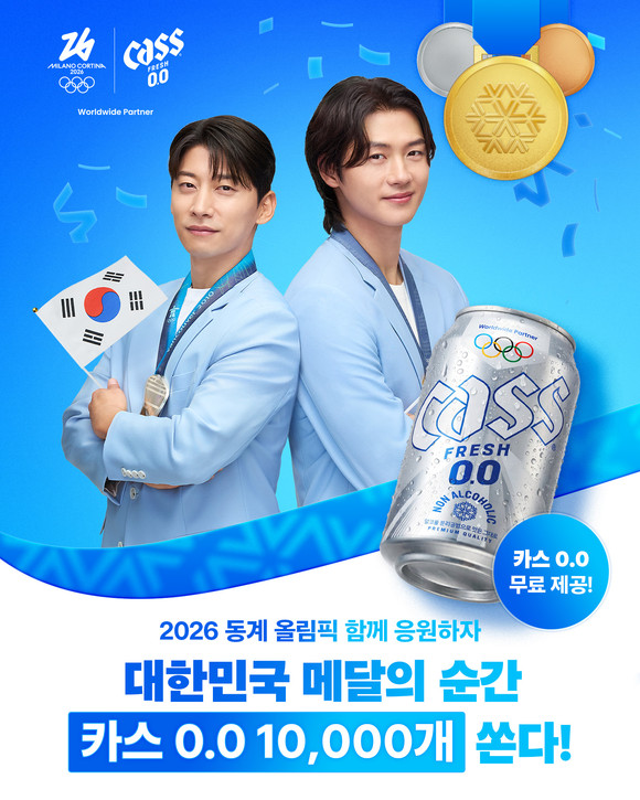 카스는 동계올림픽이 끝나는 22일까지 우리 선수단이 메달을 따는 날마다 메달 1개당 1만명에게 논알코올 음료 ‘카스 0.0’ 기프티콘을 제공한다. 금·은·동 상관없이 모든 메달에 한한다. 이와 함께 선착순 1000명에게 카스 0.0 무료 기프티콘을 증정하는 상시 이벤트도 마련했다. 올림픽 기간 내내 1인당 하루 한 번만 참여할 수 있다.