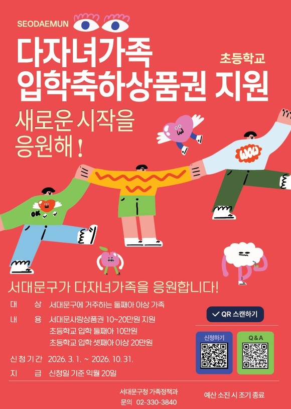 서울 서대문구(구청장 이성헌)가 다자녀 가정을 위하는 사회 분위기 조성의 일환으로 ‘다자녀가족 초등학교 입학축하 상품권 지원 사업’을 3월부터 시행한다.