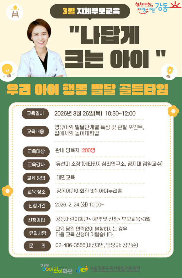 교육은 3월 26일 오전 10시 30분부터 90분간 강동어린이회관 아이누리홀에서 열린다. 관내 미취학 영유아의 양육자(조부모, 부모)면 누구나 무료로 참여할 수 있으며, 신청은 2월 24일부터 강동어린이회관 누리집(홈페이지)에서 할 수 있다.