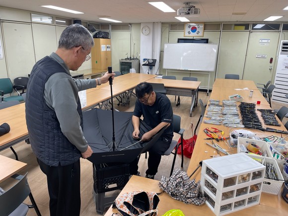 지난 3월 6일 ‘찾아가는 우산수리 팝업’ 현장인 도봉1동 주민센터 2층 교양강좌실에서 우산 수리가 한창이다. 사진=도봉구청