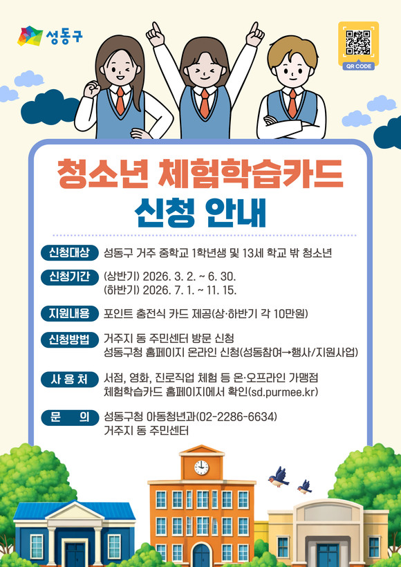 서울 성동구는 청소년들에게 진로, 문화, 예술 등 다양한 체험활동 기회를 제공하기 위해 연간 최대 20만 원의 ‘청소년 체험학습카드’를 지원한다고 밝혔다.