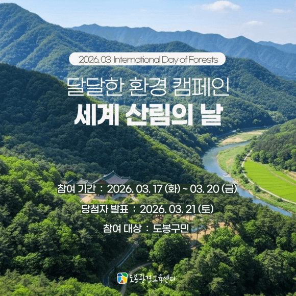 참여는 3월 17일부터 20일까지 도봉환경교육센터 누리집에 게시된 ‘세계 산림의 날’ 카드뉴스를 통해 산림 보호의 중요성을 먼저 학습한 뒤, 연결 링크로 접속해 실천 사진을 제출하는 것으로 이뤄진다.