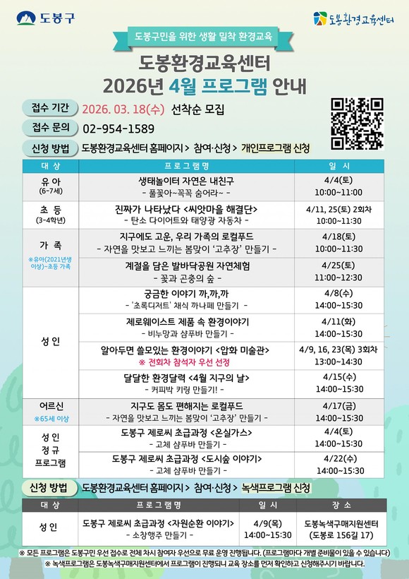 서울 도봉구(구청장 오언석)가 4월 한 달 도봉환경교육센터 등에서 총 11종의 환경교육 프로그램을 운영한다. 프로그램은 유아, 초등 3~4학년, 성인, 가족 단위 대상으로 구성됐다.