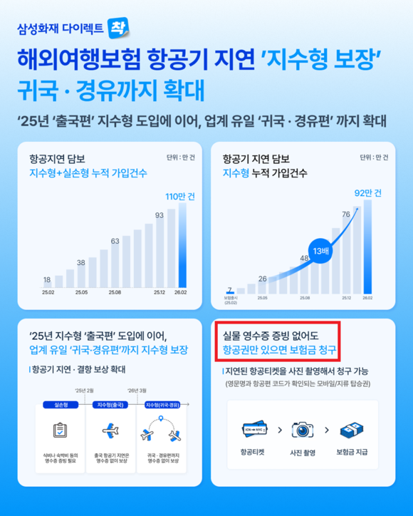 삼성화재가 항공기 지연·결항 시 보장 범위를 귀국편과 경유편까지 확대한 ‘항공기 지연·결항 보상 특약’을 출시했다. 사진=삼성화재