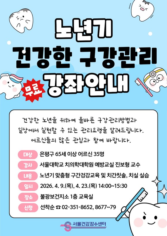 강연은 다음 달 9일과 23일 오후 2시, 불광보건지소 1층 교육실에서 진행된다. 진보형 서울대학교 치의학대학원 교수가 노년기 구강 관리의 중요성과 실생활에서 실천할 수 있는 관리 방법을 강의하며, 치간칫솔과 치실 사용법 체험 교육도 함께 진행된다.
