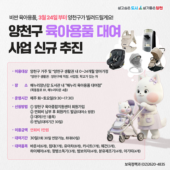 이용 대상은 양천구에 거주하거나 양천구에 직장, 사업장, 학교 등 생활권을 두고 있는 0~24개월 영아 가정으로, 연회비 1만 원만 부담하면 모든 육아용품을 대여할 수 있다.