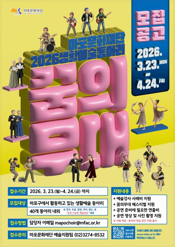 서울 마포문화재단(대표이사 고영근)은 3월 23일(월)부터 4월 24일(금)까지 마포구 생활예술 활성화 및 주민 네트워크 강화를 위한 ‘2026 생활예술 활성화 지원사업 <꿈의무대 M>’ 참여 동아리 40개 팀을 모집한다.