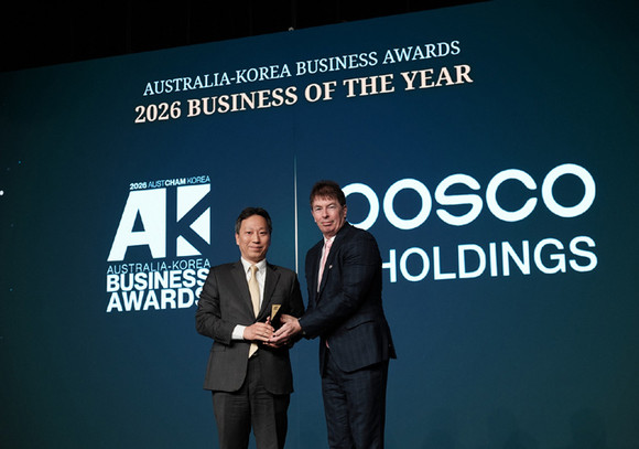 주한 호주상공회의소(AustCham Korea)가 27일 서울 용산구 그랜드 하얏트 호텔에서 열린 ‘2026 호주-한국 비즈니스 어워즈(Australia–Korea Business Awards, AKBA)’에서 포스코홀딩스를 ‘올해의 기업(Business of the Year)’으로 선정했다고 밝혔다.