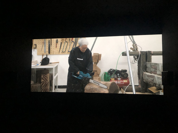 김윤신 작가의 다큐멘터리 영상. 김윤신 작가는 전기톱을 사용해 찰나의 순간에 집중해 작업한다. 사진=김금영 기자