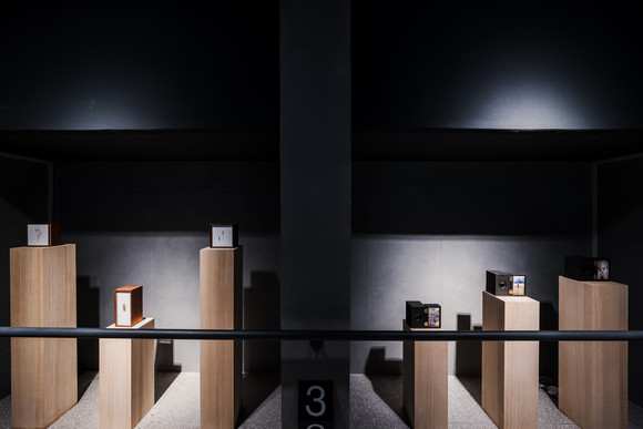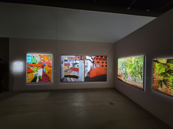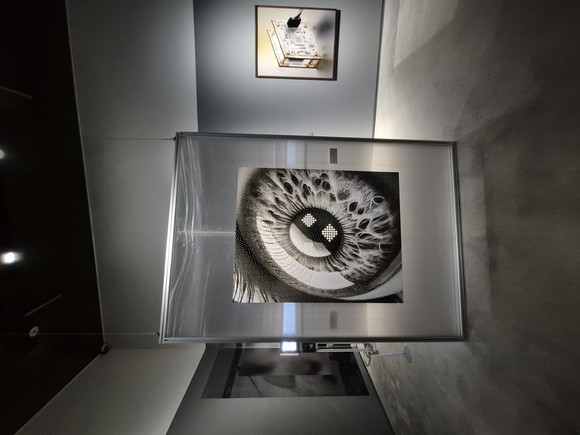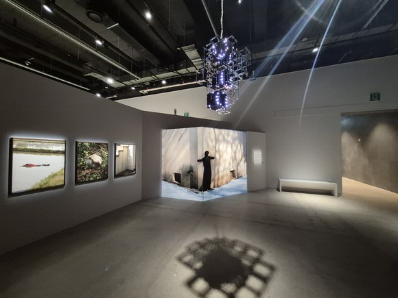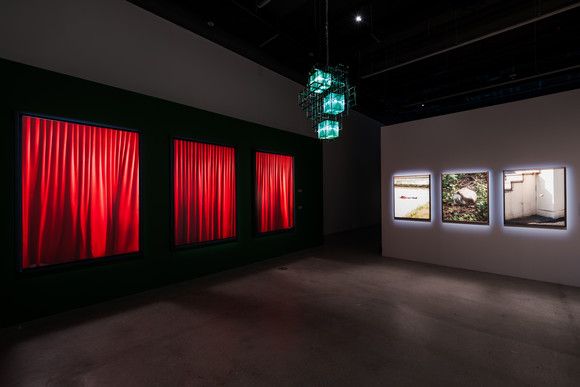 뮌 작가는 전시실 중앙에 붉은 커튼이 배치된 대형 사진이 놓이며, 샹들리에 아래 무대 막을 연상시키는 이미지는 커튼 뒤로 비치는 사물의 그림자와 함께 실재와 가상이 겹쳐진 장면을 구성한다.