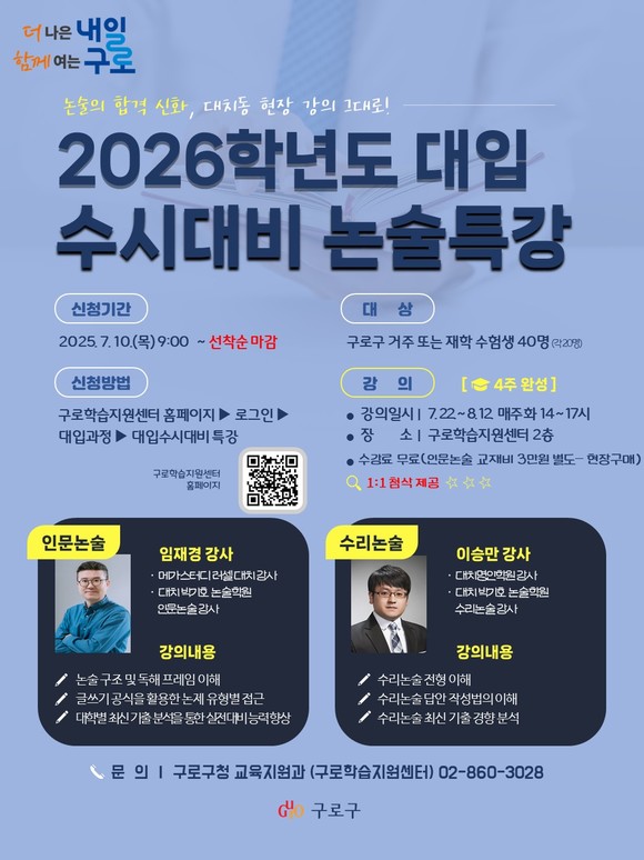 이번 특강은 사교육비 부담 경감과 수험생의 논술 역량 강화를 위해 마련됐으며, 7월 22일부터 8월 12일까지 매주 화요일 오후 2시부터 5시까지 총 4회에 걸쳐 구로학습지원센터에서 진행된다.