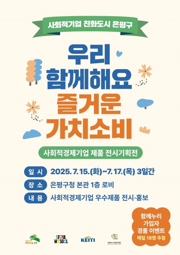 서울 은평구(구청장 김미경)는 오는 15일부터 17일까지 은평구청 본관 1층 로비에서 ‘사회적경제기업 제품 전시기획전’을 개최한다고 밝혔다.